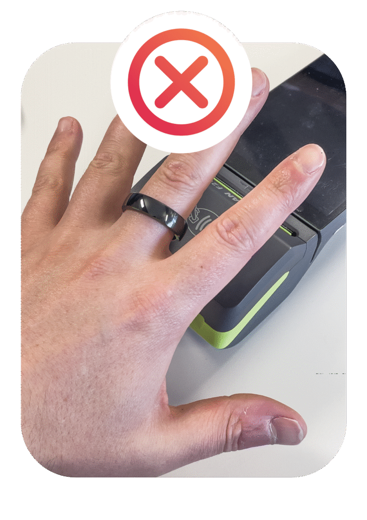 Minden készen áll! Egyszerűen viseld a fizetőgyűrűt, és érintsd a terminálhoz a kezedet ökölbe szorítva, hogy a gyűrű érintkezzen az olvasóval.